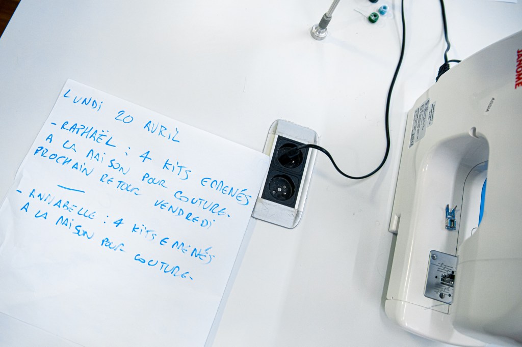 Une fois l’atelier prêt à commencer, nous nous sommes rapidement aperçus que les savoir-faire en couture sont plus répandus qu’on pouvait le penser, et plusieurs collègues ont proposé de poursuivre à domicile car disposant de tout le matériel nécessaire. On a mis en place des navettes à vélo pour bénéficier de leurs compétences, rendre viable et bien coordonné ce travail à façon. Et depuis, nos deux livreurs font des allers-retours, allant jusqu’à Bobigny pour un ravitaillement d’urgence en élastiques, ou chercher des coupons chez un fournisseur de la Ville de Paris pour attaquer la fabrication des masques adaptés pour les équipes des pôles sourds du réseau.