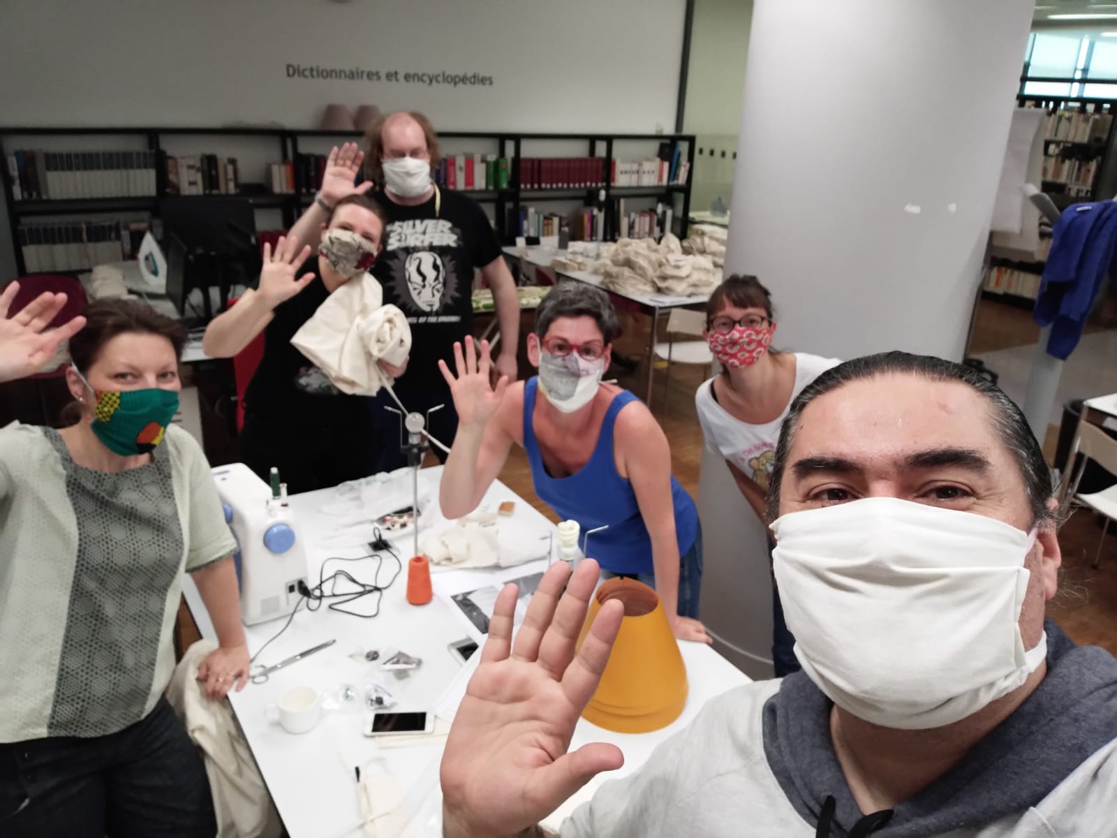 Côté textile, là aussi, le collectif a permis de monter en un temps record un atelier pour débiter des rouleaux de coton, respecter des cotes précises, ajuster les fournitures en mercerie et finalement réinventer le taylorisme dans une salle de lecture !