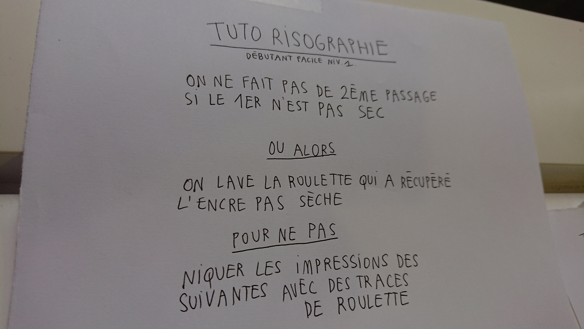 « Le duplicopieur ou risographe, parfois abrégé en copieur ou riso, est un duplicateur automatique de documents permettant de réaliser des copies multiples d’un original papier […] Le master, papier à base d’acétate recouvert de cire, vient s’enrouler sur le tambour qui est l’élément encreur du duplicopieur. En effet les cartouches de couleurs sont insérées dans des tambours qui sont introduits dans la machine, selon la couleur souhaitée pour l’impression. Comme en sérigraphie, la riso fonctionne par couche de couleur »