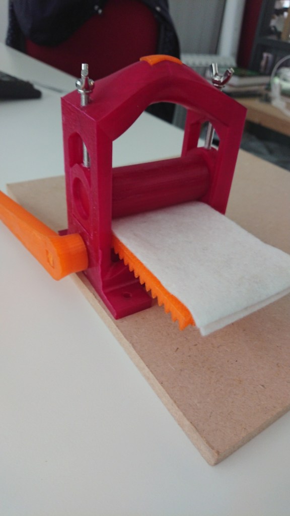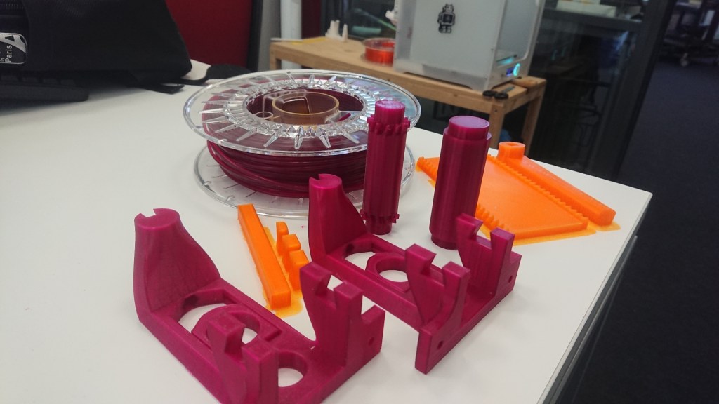 Pour l’Impression de cette Open-Press. Remplissage 50%; qualité 0.15 mn. (sauf deux montants extérieurs 25 %) PLA violet cristal ColorFAbb et Copolyester (PETG) NGen Colorfabb orange : Dureté et résistance produits chimiques.