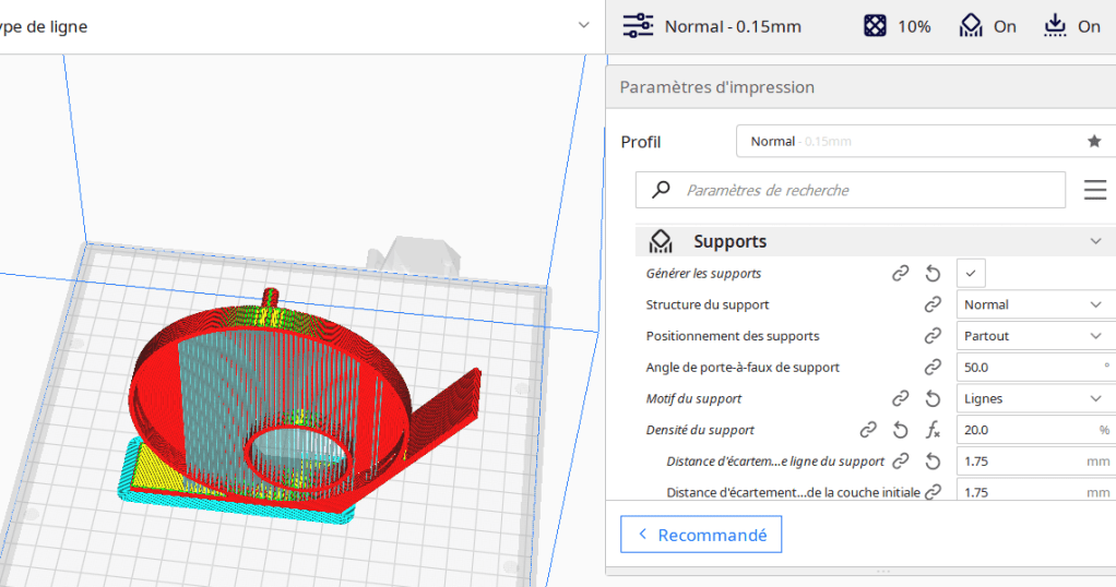 Pas de bordures ni radeau, On imprimera en 0.15 mn minimum pour la qualité des détails. Un petit support sous le menton est le bienvenu.