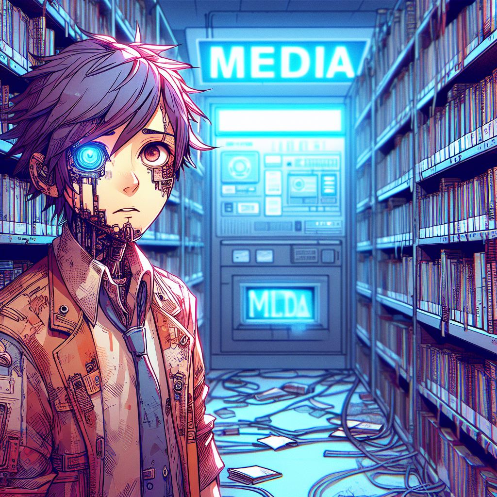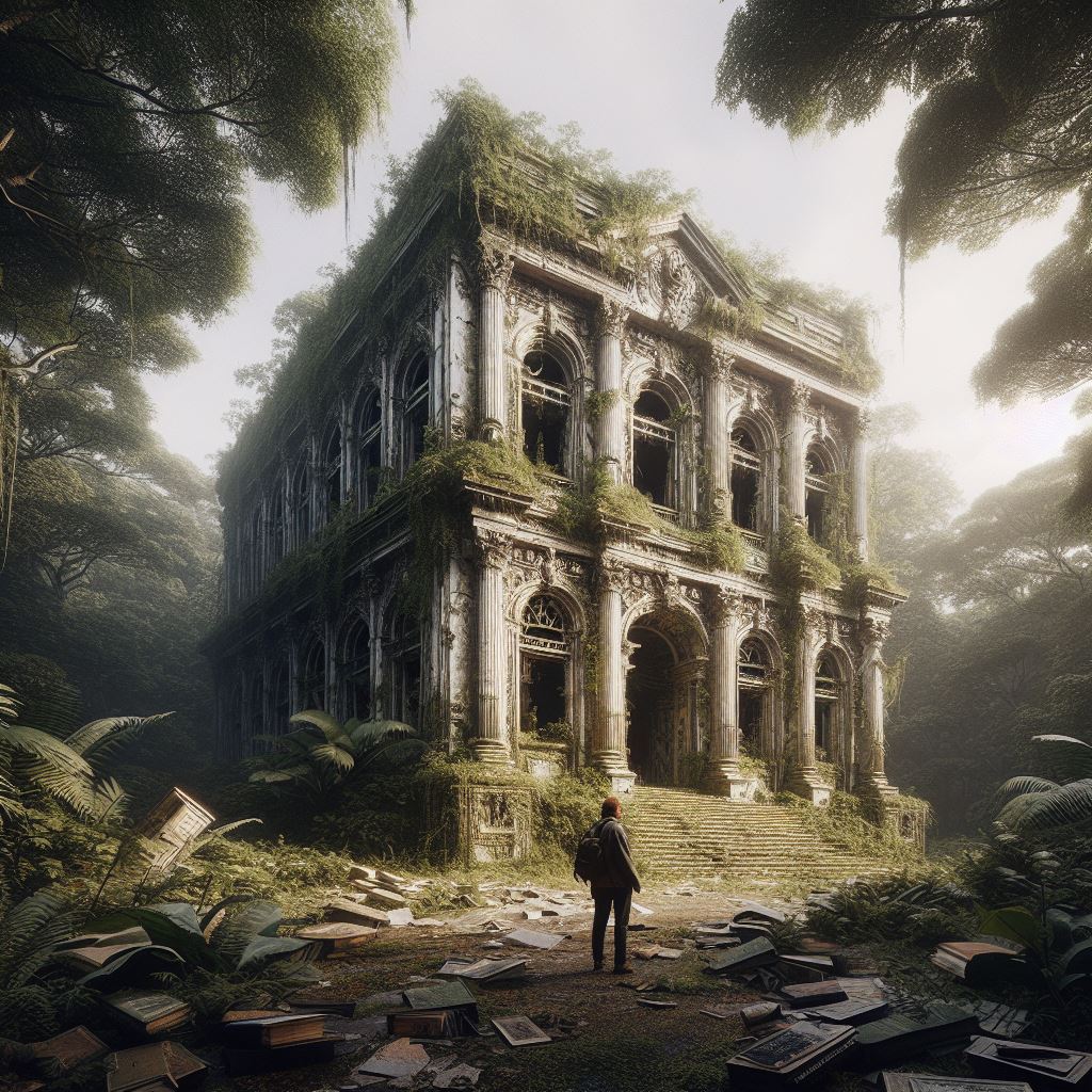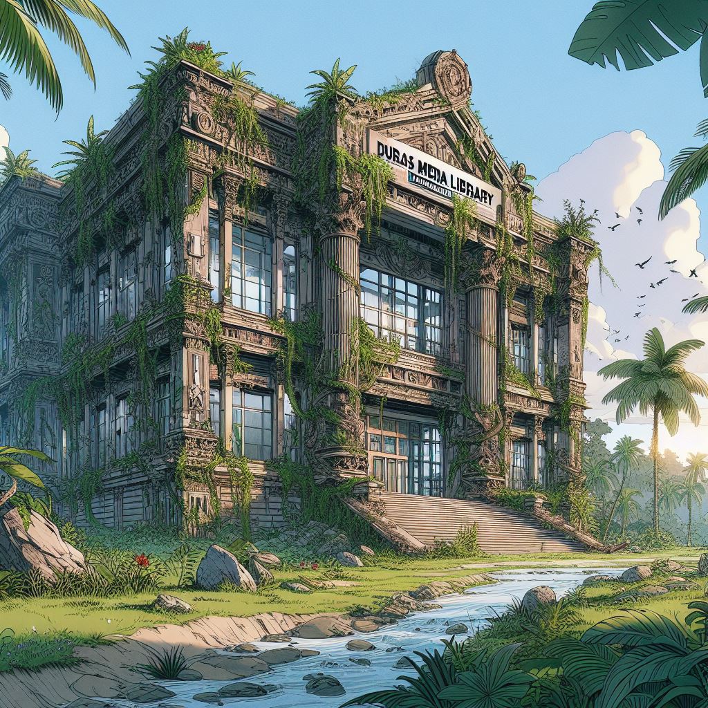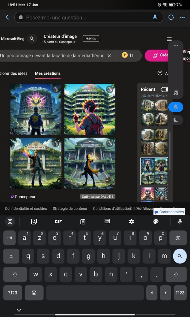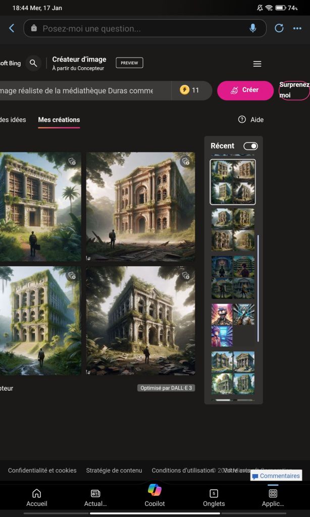 Vous suivez ? Non, cela n’est pas trop grave. En vrai, J’ai utilisé l’application Bing (sur tablette Android) qui intègre tout ces petits outils et rend la création de contenus très intuitive. Je lance Copilot, je suis parti d’un prompt (c’est le terme pour la phrase qui explique notre recherche) « Médiathèque Duras en ruine dans la jungle style manga ». Le langage est naturel, pas besoin de maîtriser un lexique contrôlé ou une grammaire adaptée encore moins un code informatique.