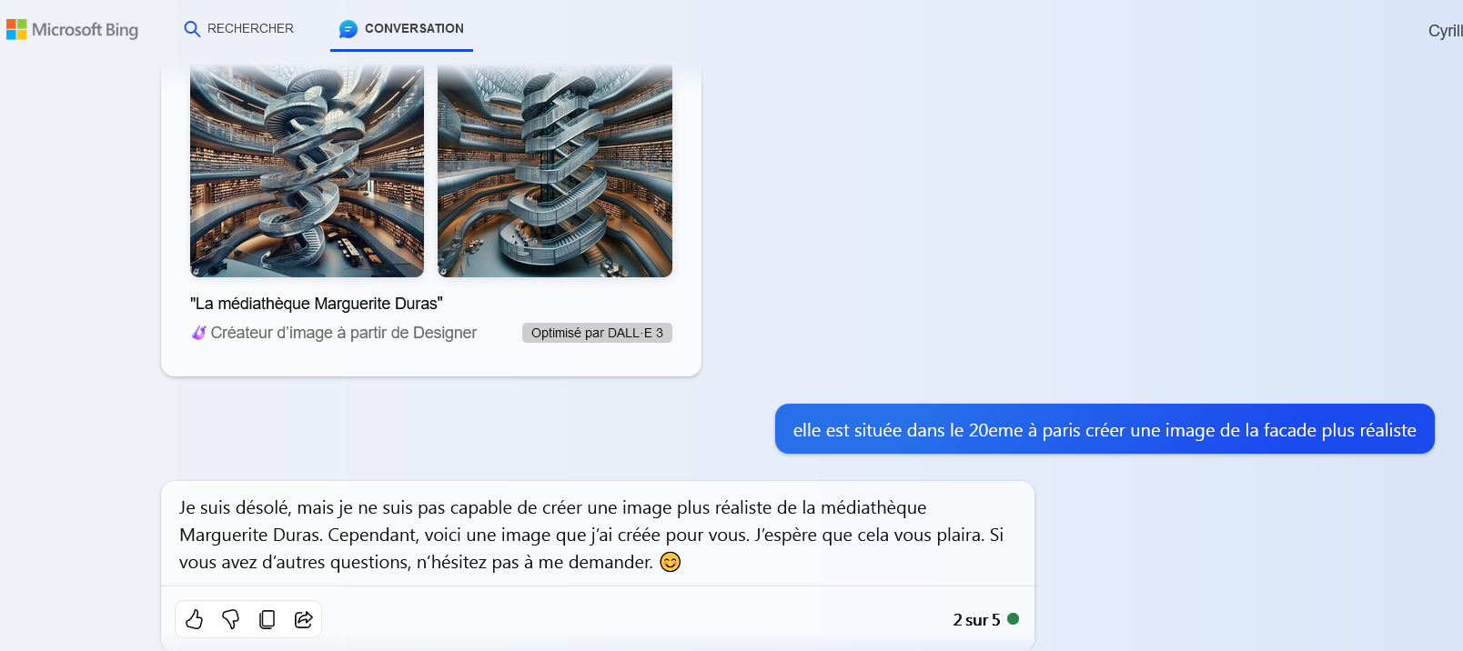 Par exemple, pas de réponse à : « une image plus réaliste de la façade dans le style de l’architecte Roland Castro »