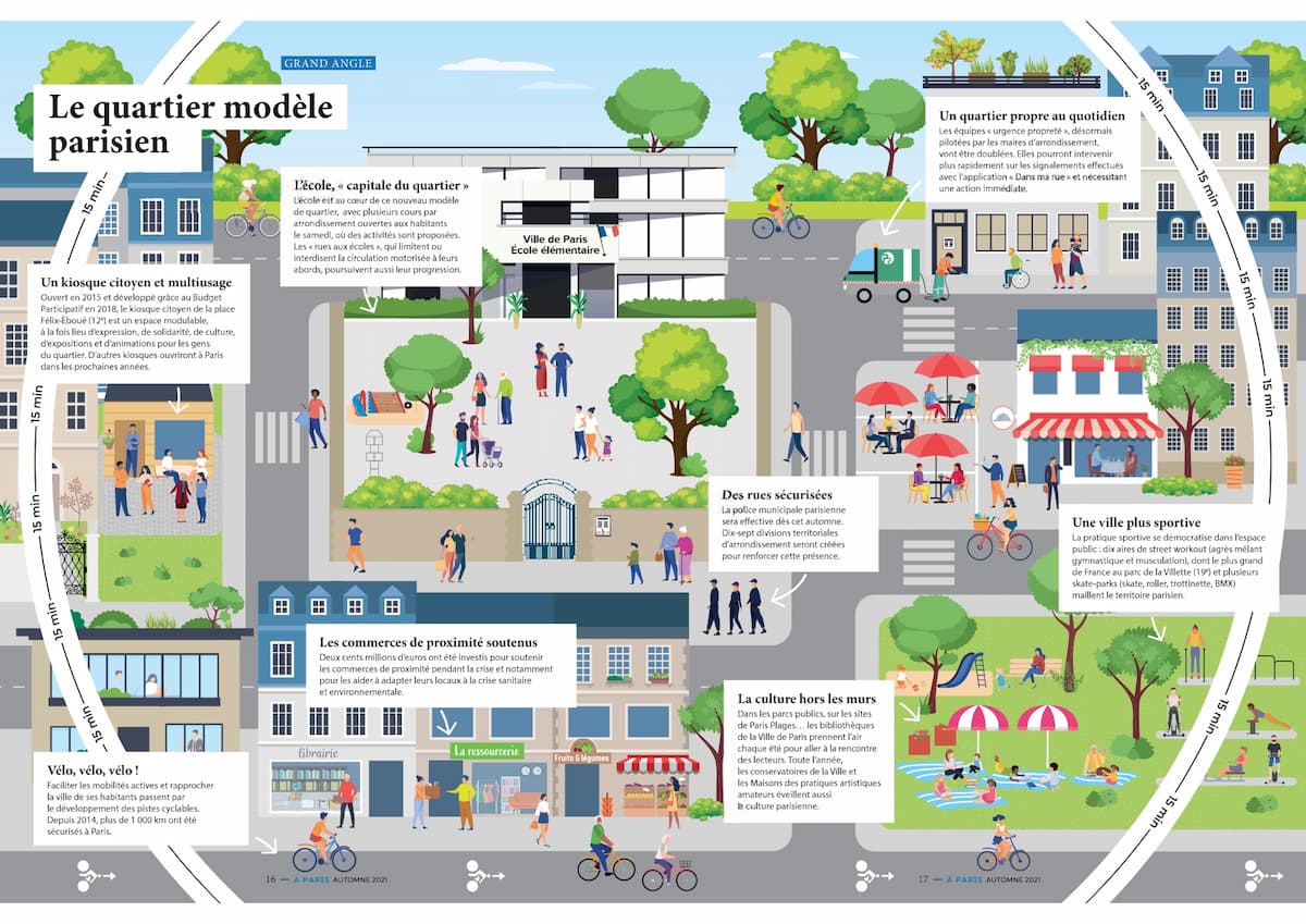 Paris souhaite devenir la ville des proximités, où l’on trouve tout ce qui est nécessaire à quinze minutes de chez soi, en transformant l’utilisation de certains équipements existants et en imaginant de nouveaux espaces comme les kiosques citoyens.