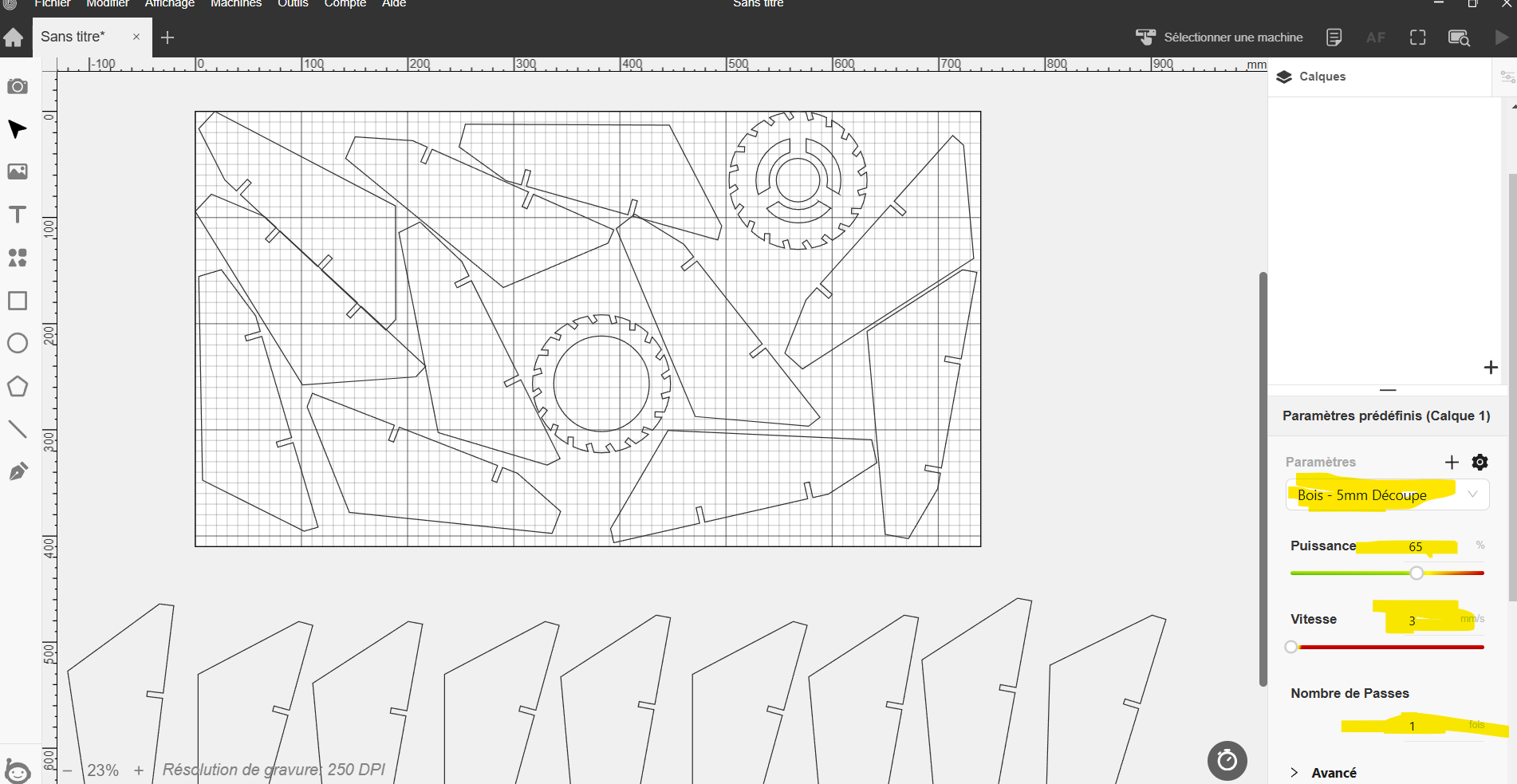 Cela dépend de votre Laser (l’épaisseur de la découpe 0,1mn environ). La modification est possible de préférence dans Inkscape. L’idée étant que cela rentre un peu en force.